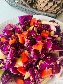 1. Wash and chop the cabbage, cucumber and bell pepper. Toss them together in a large bowl. Add chopped chicken if you wish.