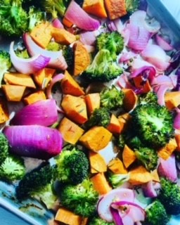 I love roasting veggies! They turn out yummy and delicious and cook in just minutes. 20-22 minutes seems to be the magic time for my oven but every oven seems to vary. Our family loves roasted veggies and throwing whatever is in season on the pan. Some of my personal favorites are sweet potatoes, asparagus, beets and purple potatoes. I like to sprinkle hemp hearts for extra protein and healthy fat. Experiment with different vegetables and see what you like! ~Mandy