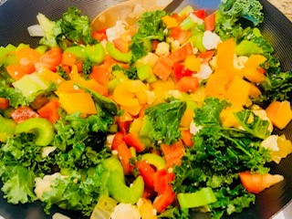 1. Saute onions first in a medium sized pan for 2 minutes until they start to brown. Then add the cauliflower, mushrooms, peppers, celery and kale in olive oil. Cook for additional few minutes until done to your liking.